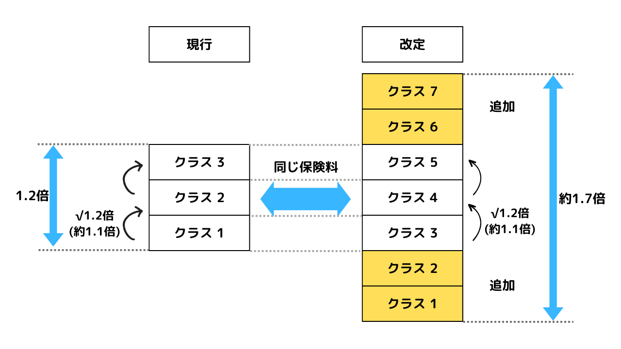 対物賠償はクラス5で現行のクラス3と同じ保険料ですが、対人賠償はリスクが高いクラス7になるため現行のクラス3より保険料が1.2倍高くなります。このように、リスクが高くなり料率クラスが上がる場合は保険料も高くなる可能性があるのです。もちろんリスクが低ければクラスも下がることもありえます。