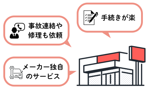 - 自動車保険をディーラーで加入すると車購入と同時に手続きができる、事故や修理のサポートを担当者に行ってもらえるなどのメリットがある。