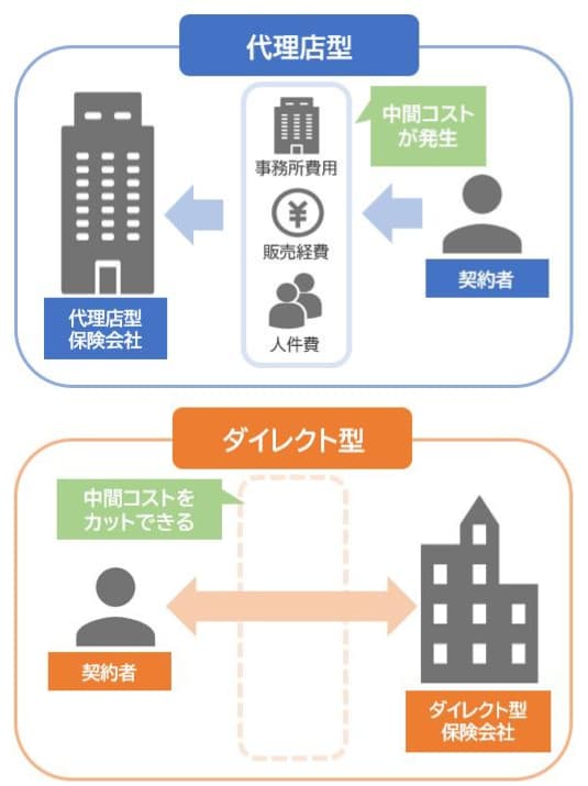 | 保険料 | 代理店手数料が不要で代理店型よりも安め。 事故リスクが高い層は保険料が高いことも。 | 代理店手数料が必要となり、ダイレクト型と比べて高め。 |