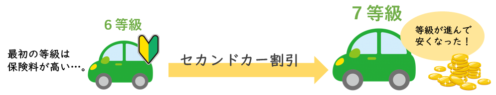 セカンドカー割引とは、2台目以降の車に初めて自動車保険を契約する場合に、適用条件を満たせば通常6等級からスタートする等級が7等級からスタートできるという割引制度です。